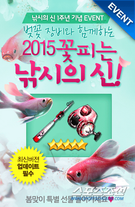 컴투스는 서비스 1주년을 맞아 '낚시의 신'을 플레이 하는든 이용자들에게 다양한 혜택을 제공하기 위해 오는 4월 28일까지 기념 이벤트를 진행한다. 이벤트 기간 동안 모든 사용자는 5성급의 고급 체험판 낚시대를 이용할 수 있으며, 봄을 맞아 출몰하는 체리 물고기를 낚으면 4성, 5성의 고급 벚꽃 장비도 획득 가능하다. 아울러 사용 에너지 환급 이벤트와 진주 사용을 통한 벚꽃잎 모으기 등 다양한 이벤트도 함께 진행된다.
