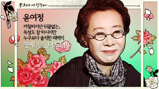"'꽃보다 누나'에 또 섭외가 들어오면 나가겠나"라고 묻자 윤여정은 대뜸 "나영석이 나하고 안하려고 할걸"하며 웃는다. "그땐 여자들을 데리고 간 게 처음이라 나 PD도 고생을 많이 했을 거야. 그런데 워낙 입이 무거운 사람이라 그런 말은 절대 안하지. 그래도 제작진들이 '처음에는 제일 무서울 것 같았는데 나중에는 고마웠다'고 그랬으니까 괜찮았던거지 뭐."