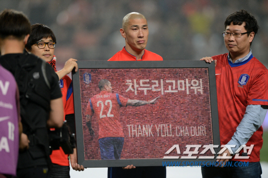 31일 서울월드컵경기장에서 열린 한국과 뉴질랜드의 경기에서 14년의 국가대표 경력을 끝으로 은퇴하는 차두리가 은퇴식을 갖고 팬들로부터 기념액자를 받고 있다. 상암=허상욱 기자 wook@sportschosun.com/2015.03.31/