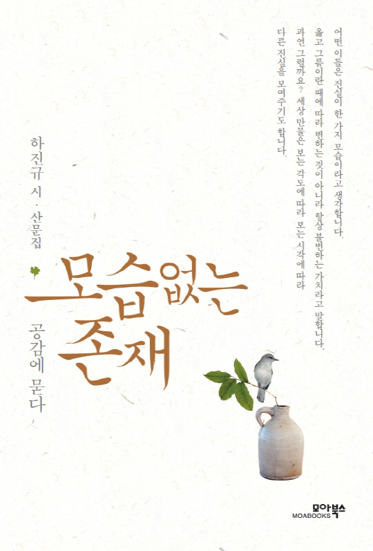 최근 출간된 '모습 없는 존재'는 삶의 진실을 성찰한 저자의 깊이 있는 시선이 돋보이는 책이다. 스리랑카 빠알리(Pali) 불교대학에서 불교사회철학을 공부하고 현재는 거시적 한국음악 노하우를 작사 작곡하고 있는 저자 하진규는 복잡다단한 세상 사람들에 대한 다양한 관점을 방대한 시편들로 풀어냈다. 원칙을 중요시하되 원칙에 함몰되지 않고 삶의 균형을 잡는 법을 유려한 언어로 노래한다.