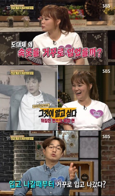 이날 경맑음은 "남편이 의심스러운 적이 있느냐"는 출연자들의 질문에 "외부 행사를 자주 나가는데 어느 날 속옷을 뒤집어 입고 들어왔더라"고 운을 뗐다.