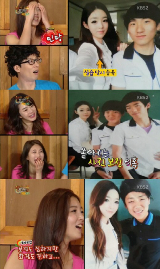 이후 방송을 통해 유승옥의 교생실습 당시 사진이 공개됐다. 현재의 모습과는 전혀 다른 유승옥의 사진속 모습은 웃음을 안기기 충분했다. 무엇보다 커다랗고 진한 까만 눈동자와 찔릴 듯 뾰족한 턱이 시선을 사로잡았다. 이에 유재석은 "바둑알이냐"고 말하며 웃음을 터트렸다.