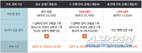 신규 유저와 복귀 유저를 위한 항목으로 새로운 이용권 상품이 등장했다. 기본적으로 30일 300시간 이용권과 빛나는 파워 패키지, 버프 패키지까지 한달 정액제 금액인 29,700원에 제공된다. 최대 3개월 동안 매달 1회씩 연속 구매가 가능하며 연속 결제 시 할인율이 누적되는 적용되는 조건을 갖추고 있다.