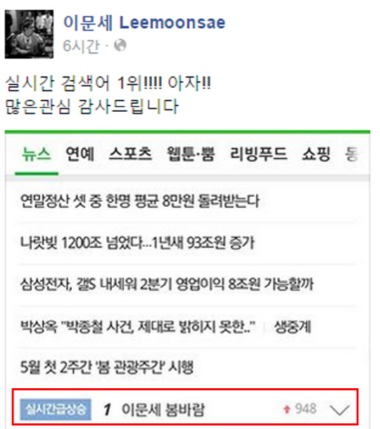 그는 이날 자신의 페이스북을 통해 "실시간 검색어 1위! 아자! 많은 관심 감사드립니다"라는 글과 함께 한 장의 캡처 사진을 게재했다. 사진 속에서 타이틀곡 '봄바람'은 실시간 검색어 1위에 당당히 올라와 있다.