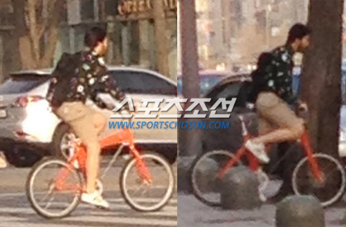 한 네티즌이 스포츠조선에 제공한 사진에서 노홍철은 지난달 30일 오후 강남 도산사거리 근처에서 빨간 자전거를 타고 백팩을 메고 여유있게 횡단보도를 건너고 있다.
