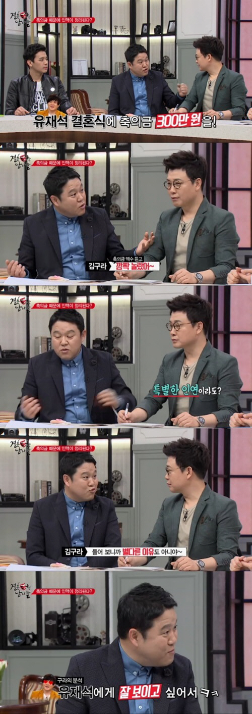 이날 김구라는 축의금 금액과 관련된 이야기를 나누던 도중 "문희준이 유재석 결혼식 때 300만 원을 냈다"고 말해 좌중을 깜짝 놀라게 했다.