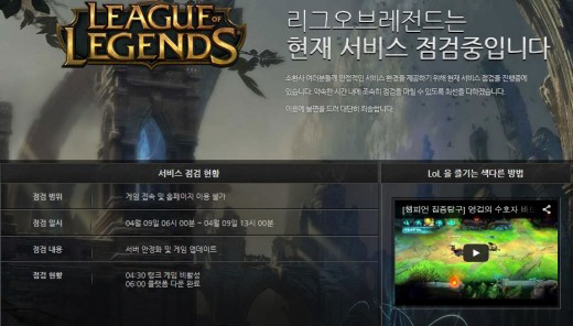 라이엇 게임즈는 9일 오전 홈페이지를 통해 "현재 서비스 점검중입니다"는 안내문을 게시했다.