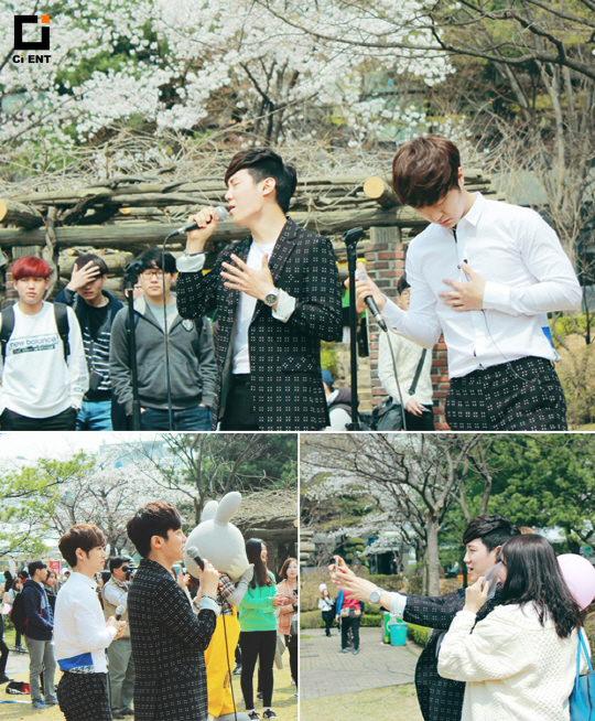 지난 3일 정규 2집 Part.1 선공개곡 '어느 봄날에'를 발표한 그룹 테이크가 8일 경기도수원에 위치한 아주대학교에서 게릴라 버스킹을 진행하며 500여명의 관객들과 즐거운 시간을 함께 한 것.
