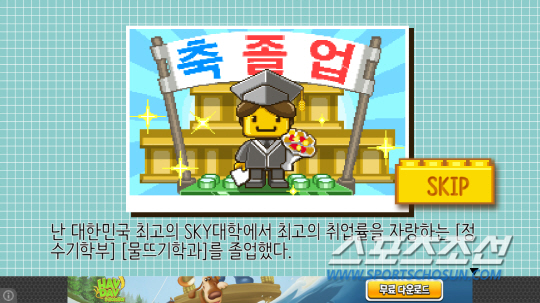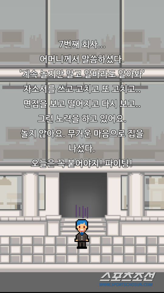 커다란 빌딩 앞 주인공이 면접을 잘 보리라 다짐하며 날리는 멘트가 플레이어의 눈물을 뽑아낸다.