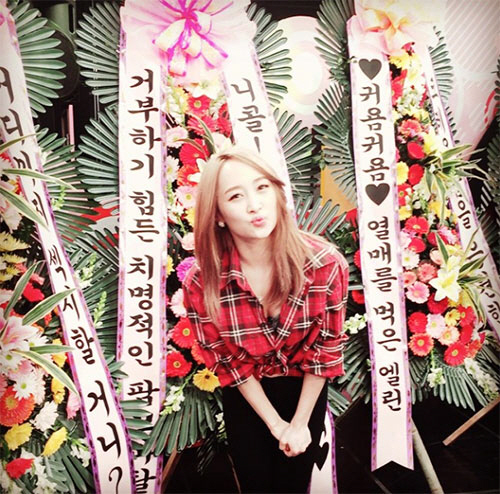 니콜의 뒤로는 해당 프로그램에 출연하는 연예인들을 응원화는 축하 화환들 놓여져 있어 눈길을 끈다.
