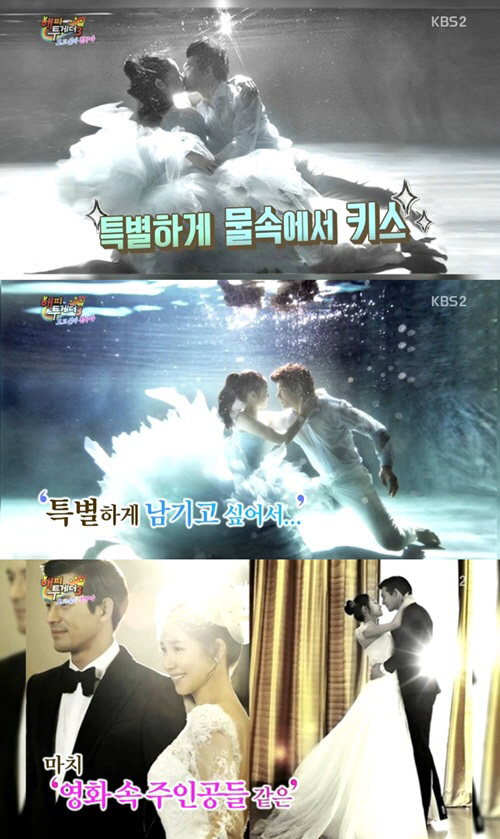 이와 함께 오지호의 웨딩사진이 공개돼 눈길을 끌었다. 두 사람은 웨딩드레스와 턱시도를 입고 직접 물속으로 들어가 키스를 나누며 영화 속 한 장면 같은 모습을 연출해 감탄을 자아냈다.