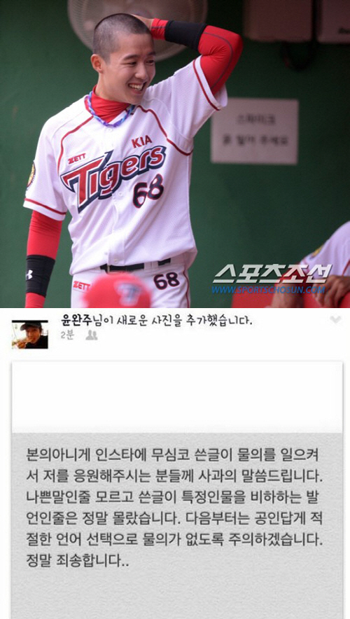"본의 아니게 무심코 쓴 글이 물의를 일으켜 저를 응원해주는 분들께 사과의 말씀을 드립니다"라며 "나쁜 말인 줄 모르고 쓴 글이 특정 인물을 비하하는 발언인 줄은 정말 몰랐습니다"고 고개를 숙였다. <스포츠조선닷컴>