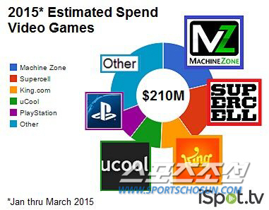 해외 광고 분석 매체 iSpot.tv는 2015년 1분기 동안 북미 시장에서 집행된 게임 TV광고의 전체 금액과 각 게임사간의 광고 비중 등을 종합해 이미지 자료로 선보였다. 지난 분기 북미의 유력 게임사들이 TV 광고에 쏟아부은 돈은 약 2억1천만 달러(약 2천3백억원)다. 특히 '클래쉬오브클랜'의 슈퍼셀과 '캔디크러쉬사가'의 킹, '히어로스차지'의 유쿨, '게임오브워'의 머신존이 이 중 약 60%를 차지했다.