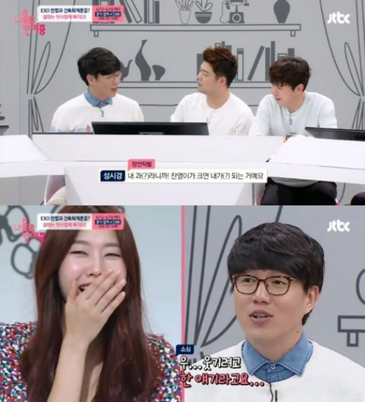 특히 성시경은 '다른 남자에게 공개 고백을 받았다! 당신의 행동은?'이라는 질문에 이야기를 나누던 중 "찬열이가 내 과다. 찬열이가 크면 내가 되는 거다"라고 말했다.