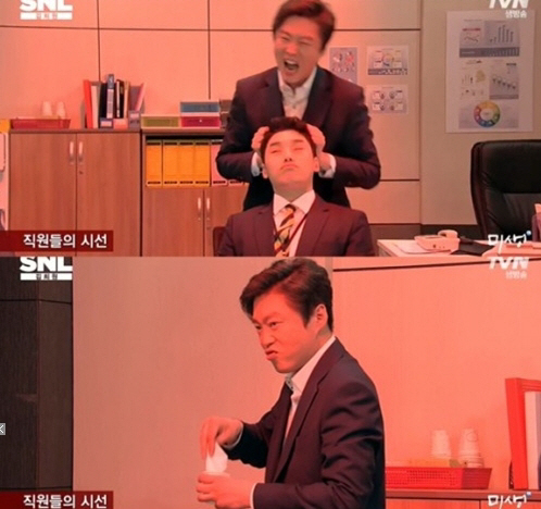 이에 'SNL'에서 김희원은 장그래 역의 권혁수에 "열심히 하면 정규직이 될 수 있을 거다"며 두피마사지를 해줬다. 하지만 직원들의 시선에서는 그가 권혁수를 괴롭히고 있는 모습으로 비춰졌다.