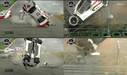 사고 직후 공중에서 4~5회 가량 크게 회전한 뒤 앞뒤 타이어, 차체, 차량 출입문 등이 모두 떨어져나갔다. 또한 펜스와 보호벽에 부딪힌 차량은 화염에 휩싸이면서 대회를 지켜보던 관람객들의 간담을 서늘하게 했다. <스포츠조선닷컴>