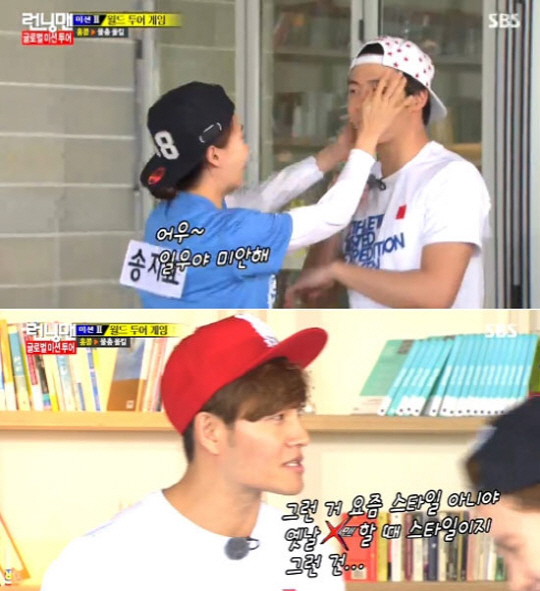 홍일점 송지효에게만은 다른 모습을 보여줬다. 달려오는 상대편 송지효에게 물총을 쏘는 대신 꽃받침을 만든 후 송지효가 자신의 얼굴에 물총을 쏠때까지 기다려줬다. 일부러 져주는 모습에 3인 팀은 분노했고, 김종국은 "그런 건 요즘 스타일 아니다. 'X맨' 시절 스타일이다"라고 외쳐 웃음을 자아냈다. <스포츠조선닷컴>