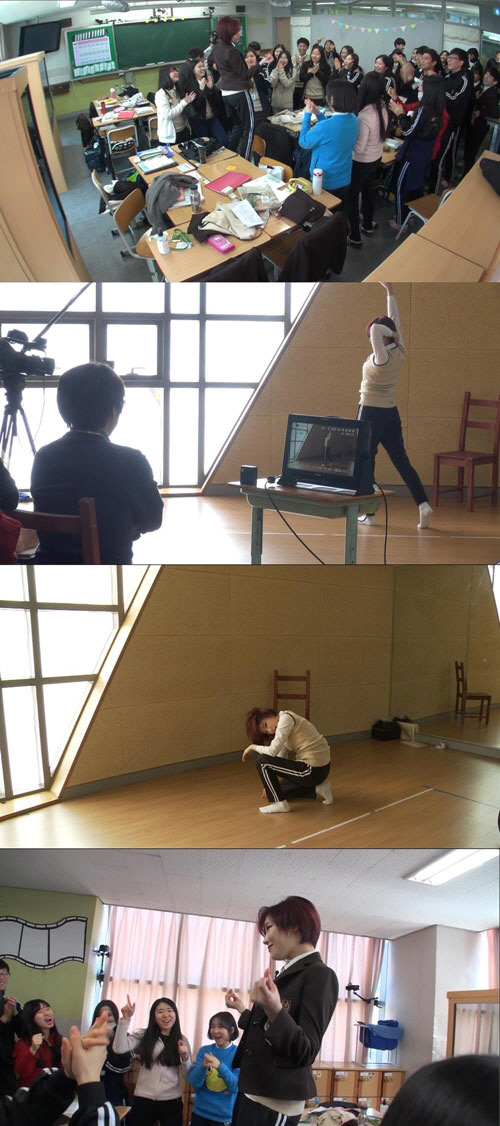 체육복 차림으로도 섹시미를 드러낸 가인은 점심시간에도 음악방송에 맞춰 의자 위에서 춤을 추는 등 타고난 끼를 발산했다.