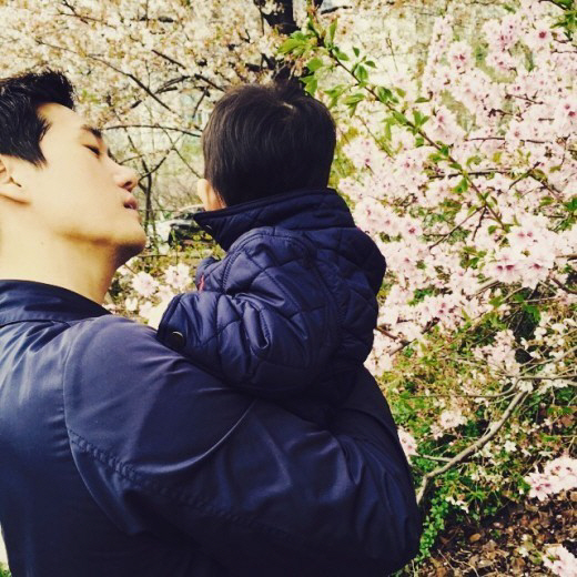 사진에는 벚꽃을 보는 아들 수인 군을 품에 안고 사랑스럽게 바라보는 유지태의 모습이 담겨 있다.