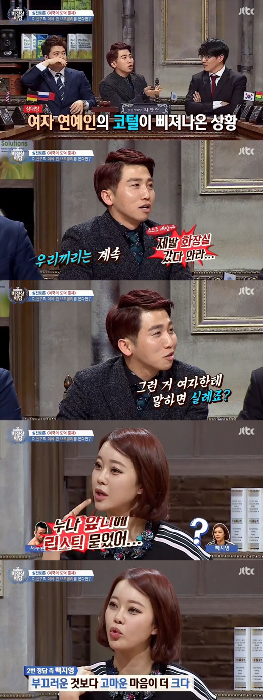 이에 백지영은 "예전에 서두원 선수 도장을 오픈하는데 간 적이 있었다. 그날 너무 환하게 웃는 바람에 립스틱이 이에 묻었더라"며 "친구들과 좋아서 막 웃고 있었는데 서두원이 나를 화장실로 불러서 알려주더라. 묻은 게 아니라 앞니에 립스틱을 바른 정도더라. 민망한데 너무 고마웠다"며 자신의 일화를 털어놔 시선이 집중됐다. <스포츠조선닷컴>