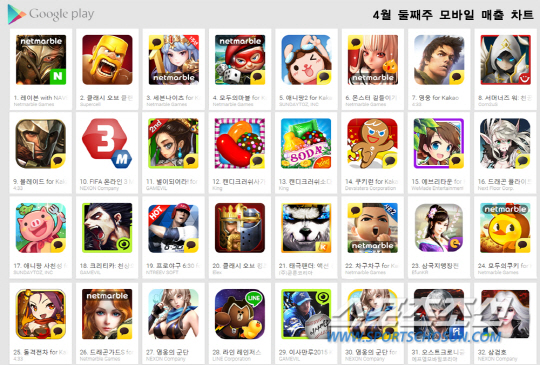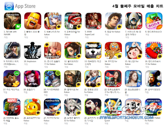 20위부터 30위까지의 하위권에서는 기존 게임들이 순위를 바꾸며 경쟁을 지속했다. 게임빌의 신작인 '이사만루 2015 KBO'는 신규 서비스 직후 29위에 올라 최근 프로야구 개막으로 뜨거워진 야구 게임에 대한 관심을 느낄 수 있었다.