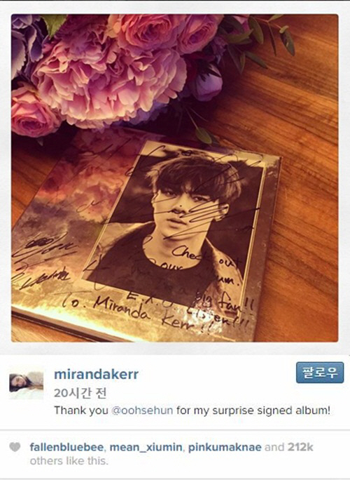 미란다 커는 4월 12일(이하 현지시간) 자신의 인스타그램 계정에 엑소 멤버 세훈이 자신의 사진과 함께 보내온 엑소의 2집 정규앨범 '액소더스' 사인 CD를 게재했다.