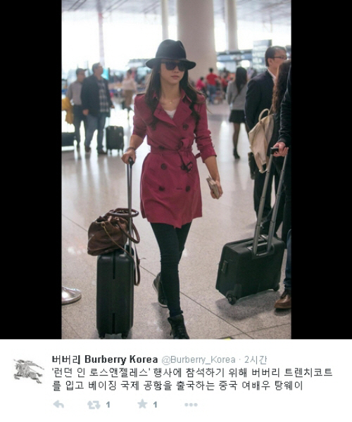 탕웨이는 와인색 트렌치코트와 선글라스로 시크한 패션을 선보이고 있다.