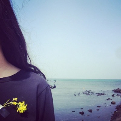 이하늬는 제주 앞바다를 배경으로 가슴에 노란꽃을 달고 있다.