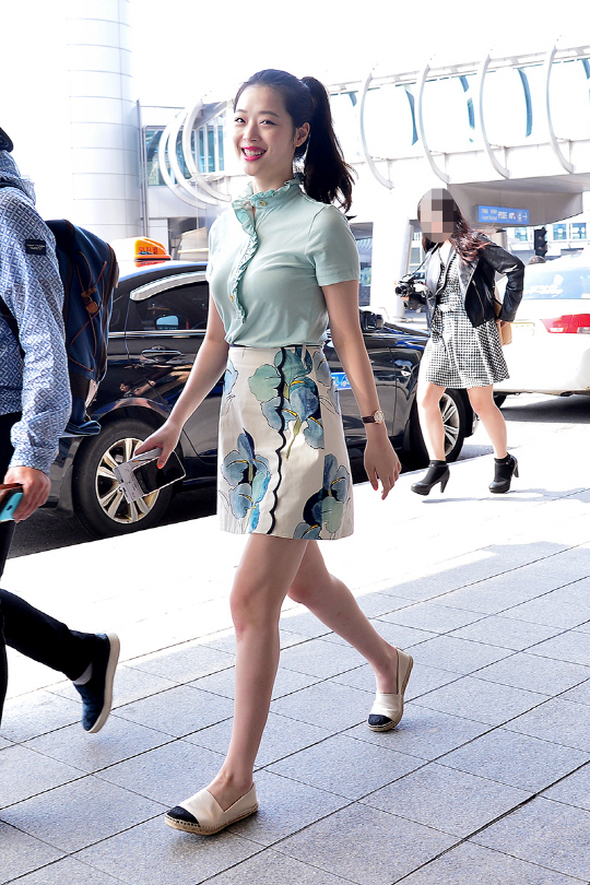 화보 촬영 차 출국하는 에프엑스 설리의 모습이에요. 그녀는 스카이 블루 컬러의 반팔 셔츠에 짧은 스커트를 매치했습니다. 스커트 가득 그려진 플라워 프린팅이 상큼하고 발랄한 느낌을 전하네요. 환한 그녀의 미소만큼이나 밝고 화사한 출국패션이었습니다. 설리의 스커트는 토리버치 제품. 가격은 43만원대입니다. <스포츠조선 연예패션팀>