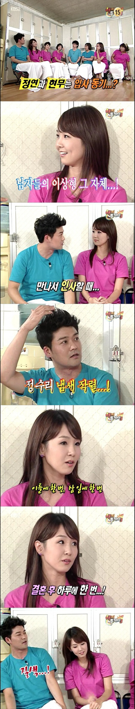 전현무는 청초한 매력의 오정연에게 소위 '깨는' 사건이 있었다고 밝혔다. 전현무는 "당시만 해도 서로 존대말을 할 때라 고개를 숙여 인사하는데 정수리 냄새가 너무 많이 났다. 아무리 피곤하다고 해도 충격이 컸다"며 당시 상황을 코믹하게 재현해 웃음을 자아냈다.