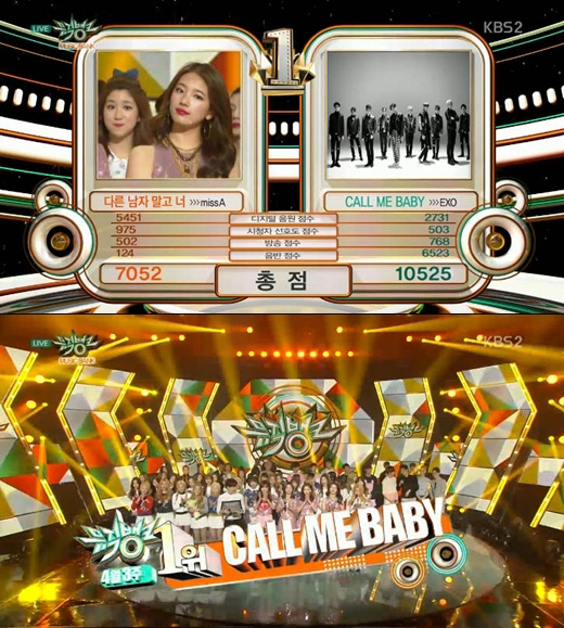 엑소는 17일 오후 방송된 KBS 2TV '뮤직뱅크'에서 '콜미 베이비'로 1위를 차지했다.