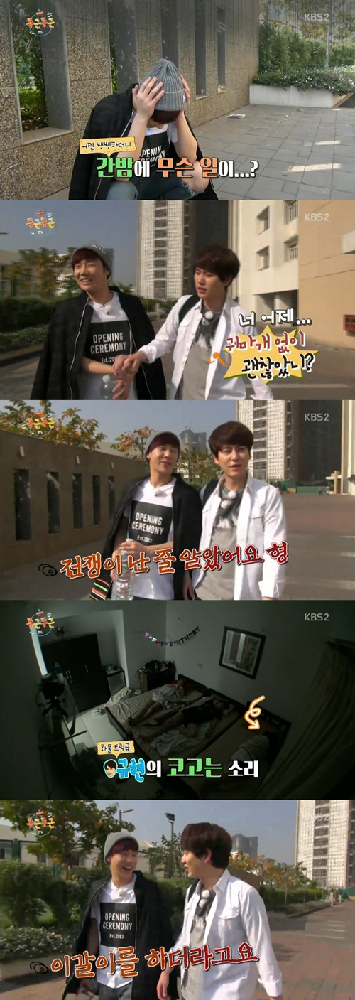 이날 새로운 아침을 맞은 성규는 멤버들과 만난 자리에서 "너 어제 귀마개 없이 괜찮았니?"라는 규현의 질문에 "전쟁이 난 줄 알았다"고 답했다.