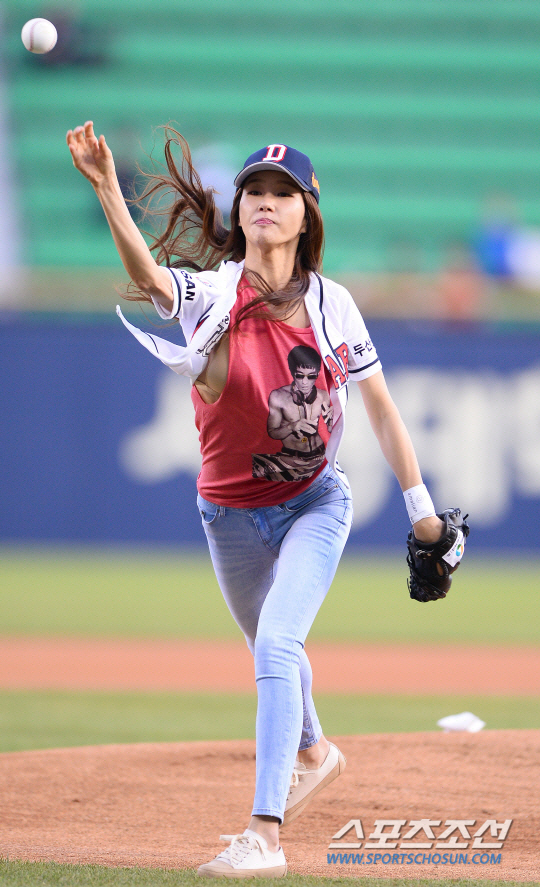 이날 두산 시구자로 나선 김정민은 민소매 상의 위에 두산 유니폼을 걸치고 힘차게 공을 던졌다. 하지만 시구를 하는 과정에서 김정민의 속옷이 노출되는 사고를 겪었다. <스포츠조선닷컴>