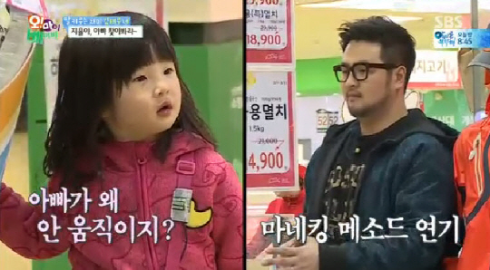 이어 아빠 김태우를 찾은 두 딸 소율, 지율은 마치 마네킹으로 변신한 듯 움직이지 않는 아빠 모습에 긴가민가하며 쉽게 다가가지 못하는 순수한 모습을 보이기도 했다.