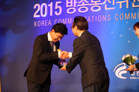 ◇한국바둑방송(K-바둑) 윤여창 대표(왼쪽)가 20일 롯데호텔에서 열린 '2015 방송통신위원회 방송대상'에서 제작역량우수상을 받고 있다. 사진제공=K-바둑