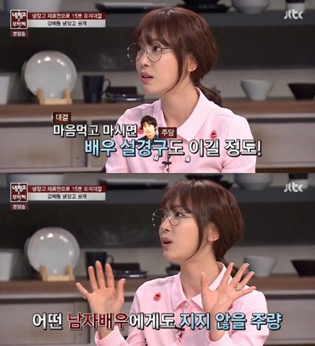 이날 강예원은 자신의 냉장고에서 와인이 나오자 "작정하고 마시면 설경구도 이긴다. 어떤 남자배우가 와도 이길 수 있다"고 자신의 주량을 자신 있게 공개해 모두를 놀라게 했다.