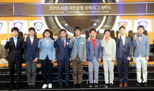 ◇2015 KB국민은행 바둑리그에 출전하는 9개 팀 대표선수들이 선전을 다짐하고 있다. 왼쪽부터 포스코켐텍 나 현, CJ E&M 강동윤, KIxx 김지석, 한국물가정보 원성진, SK엔크린 박영훈, 정관장 황진단 이창호, 화성시코리요 최철한, 신안천일염 조한승, 티브로드 박정환 선수. 사진제공=한국기원