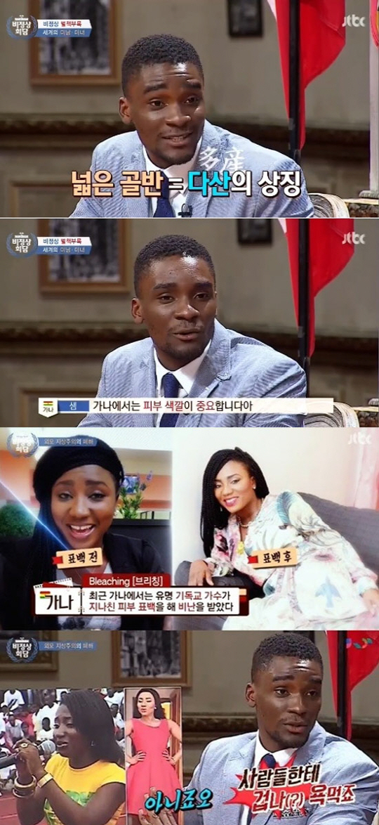 이날 샘 오취리는 "가나에서는 여자를 볼 때 골반부터 본다. 결혼할 때 넓은 골반의 여자를 선택한다. 아이를 많이 낳을 수 있다고 믿기 때문이다"며 "가나에서도 피부 색깔이 중요하다. 하얄수록 더 예쁘다고 생각한다"고 설명했다.