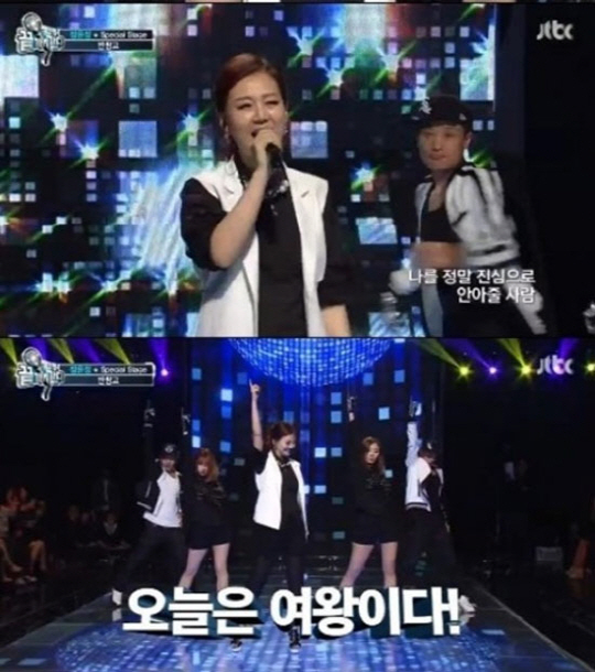 이날 장윤정은 "인기가요도 아니고 뮤직뱅크도 아니고 음악 중심도 아니고 노래자랑도 아니고, 끝까지 간다에서 노래를 부르게 됐다"라고 너스레를 떨었다.