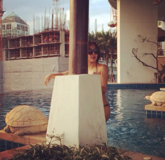 나르샤는 수영장으로 보이는 곳에서 비키니를 입고 있으며, 수영장 기둥에 살짝 드러난 몸매가 묘한 호기심을 불러일으키고 있다.