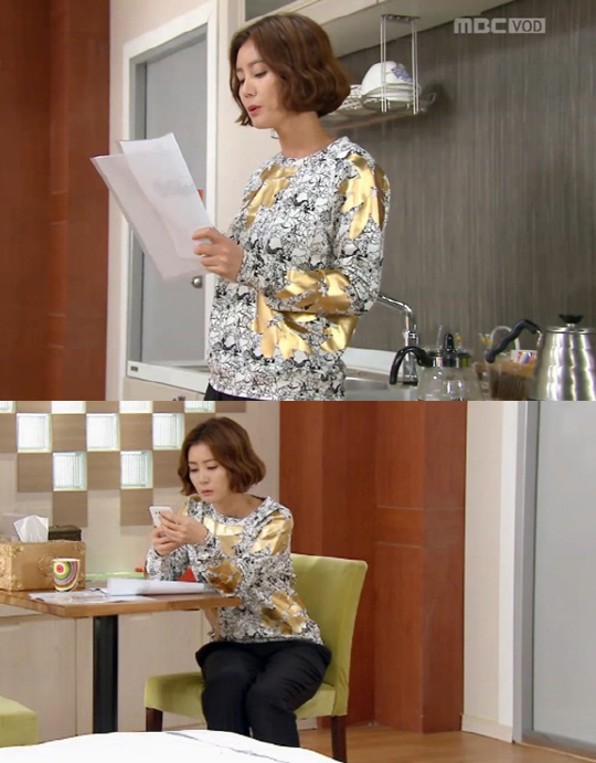 MBC 드라마 '여왕의 꽃'의 김성령은 극 중에서 화려한 패션을 주로 선보이는데요, 11회에 등장한 티셔츠 역시 남다릅니다. 화이트 컬러의 바탕에 블랙 컬러의 플라워 패턴이 티셔츠 전체를 뒤덮고 있어요. 군데군데에 돋보이는 더 큰 골드컬러의 플라워 패턴으로 블링블링한 느낌을 가득 전해요. 그녀는 같이 블랙 컬러의 기본 팬츠와 매치하여 티셔츠가 더욱 돋보이게 했네요. 에센셜의 제품. 가격은 28만원대입니다. <스포츠조선 연예패션팀>
