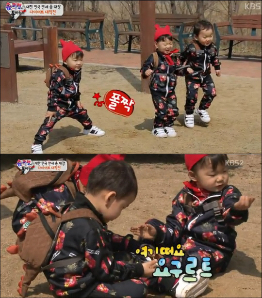 아빠와 함께 산책에 나선 삼둥이들. 은근히 시크한 트레이닝 복을 셋이 똑같이 입었어요. 화사한 플라워 패턴이 가득하지만 짙은 블랙 컬러의 바탕색과 어우러져 스타일리쉬한 느낌까지 풍기는데요? 활동하기도 편한지 더욱 신나 보이는 대한-민국-만세의 모습. NBA의 키즈 시카고 불스 플라워 패턴 트레이닝 집업입니다. 품번은 상의 N151TJ510P, 하의는 N151TP510P, 가격은 각각 5만원대. 3만원대입니다. <스포츠조선 연예패션팀>