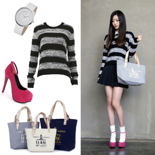 | 에코백을 활용한 코디. 에코백은 유나이티드뱀부 제품. 사진제공=핑크레인컴 |