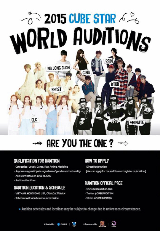 포미닛, 비스트, 지나, 비투비, 비, 씨엘씨, 김기리 등이 소속된 큐브엔터테인먼트는 최근 큐브 공식 SNS를 통해 2015 큐브스타 월드 오디션의 티저 영상을 공개하고 대대적인 글로벌 오디션 개최의 시작을 알렸다. 큐브엔터테인먼트는 올 1월부터 시작된 국내 전국 예선을 마무리하고 4월 홍콩, 5월에는 미국과 캐나다, 6월 대만, 베트남 오디션 오디션을 예정, 전 세계를 무대로 더욱 광범위한 글로벌 인재 발굴에 나설 계획이다.