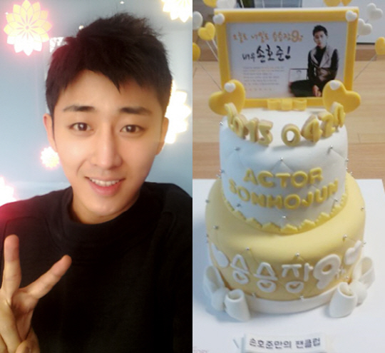 리본이 달린 2단 케이크 위에는 손호준의 사진과 함께 '오늘도 내일도 승승장9 배우 손호준!'이라는 센스 있는 문구로 시선을 집중시켰다.