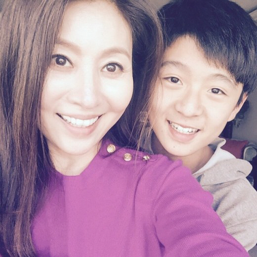 최명길은 아들 무진 군과 다정한 포즈를 취하며 카메라를 바라보고 있다.