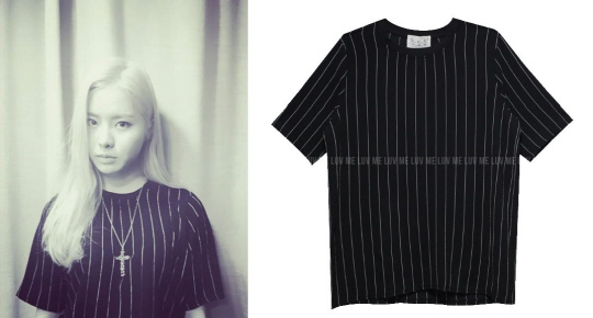 컴백을 예고하며 자신의 SNS에 일상 사진을 공개한 가수 김예림. 그녀는 세로방향의 핀스트라이프가 돋보이는 블랙컬러 짧은 소매의 티셔츠를 착용했네요. 액세서리는 물론 스냅백, 헤어밴드 등의 아이템과 매치해도 잘 어울릴 것 같은 기본 티셔츠입니다. 그녀의 사진에서 느껴지는 시크한 분위기에는 스타일링의 힘이 크게 작용했습니다. 빅 쉐이프의 십자가 목걸이와 샛노란 헤어컬러, 거기에 소울풀한 그녀만의 감성까지 더해져 저렴한 제품으로도 힙한 느낌 가득 풍기는 룩을 연출했네요. 또한 주목할 점은 트렌드에 민감한 20대 초반의 나이답게 인터넷 쇼핑몰을 통해 스마트한 구매에 성공했다는 것이에요.