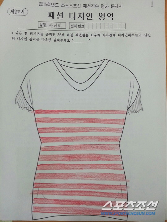 한참의 시간이 지난 뒤, 마지막 장을 펴니 예상치 못한 2교시 문제지가 등장합니다. 티셔츠 디자인을 하라며 36색 색연필을 내미는 기자를 원망스러운 눈빛으로 바라봅니다. "아니, 이것도 하는 건가요?" 하지만 창의력 증진(?)을 위한 디자인 영역 문제는 상식 영역보다는 쉬웠나 봅니다. 몇 번의 망설임 끝에 빨간색 색연필을 선택해 스트라이프 티셔츠를 만듭니다. 평소 스트라이프를 즐겨입는다고 '팔로우미'를 통해 밝힌 바 있습니다. 꽤나 공들여 스트라이프의 색을 칠한 아이비에게 완성본을 들고 사진을 찍자고 하자, "아직 끝난 게 아니에요"라는 단호한 말이 돌아옵니다. 그녀는 소매 부분에 레이스 디테일을 그려넣습니다. 문제 출제자로서 이렇듯 정성들이는 그녀가 무척이나 고마웠습니다.