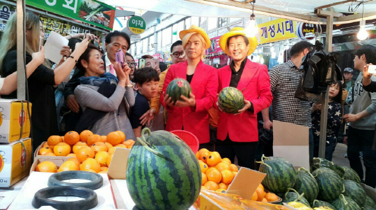 빨간색 재킷과 노란색 모자를 맞춰 입은 태진아와 강남은 예정보다 앞선 오후 1시부터 장보기 이벤트를 진행했다. 충청도가 낳은 '트로트 황제' 태진아와 꽃미남 가수 강남의 동반 방문에 시장 일대가 술렁였다. 남녀노소 가릴거 없이 수백 명의 인파가 핸드폰과 사진기를 들고 이들을 따라다녀 주변 통행이 마비될 정도였다.