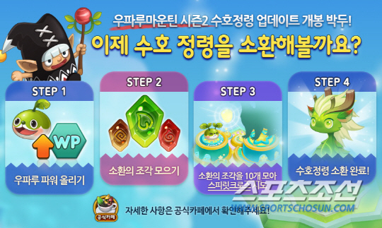 NHN스튜디오629는 시즌2 수호정령 업데이트를 기념해 이벤트를 준비했다. 27일부터 5월 15일까지 진행되며, 우파루 5마리를 파워 5레벨에 달성시키면 보석 10개를 제공하고, 정령석 10개를 모으면 '우파루마운틴' 기념 휴대폰케이스를 200명 추첨을 통해 지급한다. 또 수호정령 '다프네', '네프', '네이핀' 소환 시 각각 보석 100개, 500개, 1000개를 제공한다. 남정석 기자 bluesky@sportschosun.com